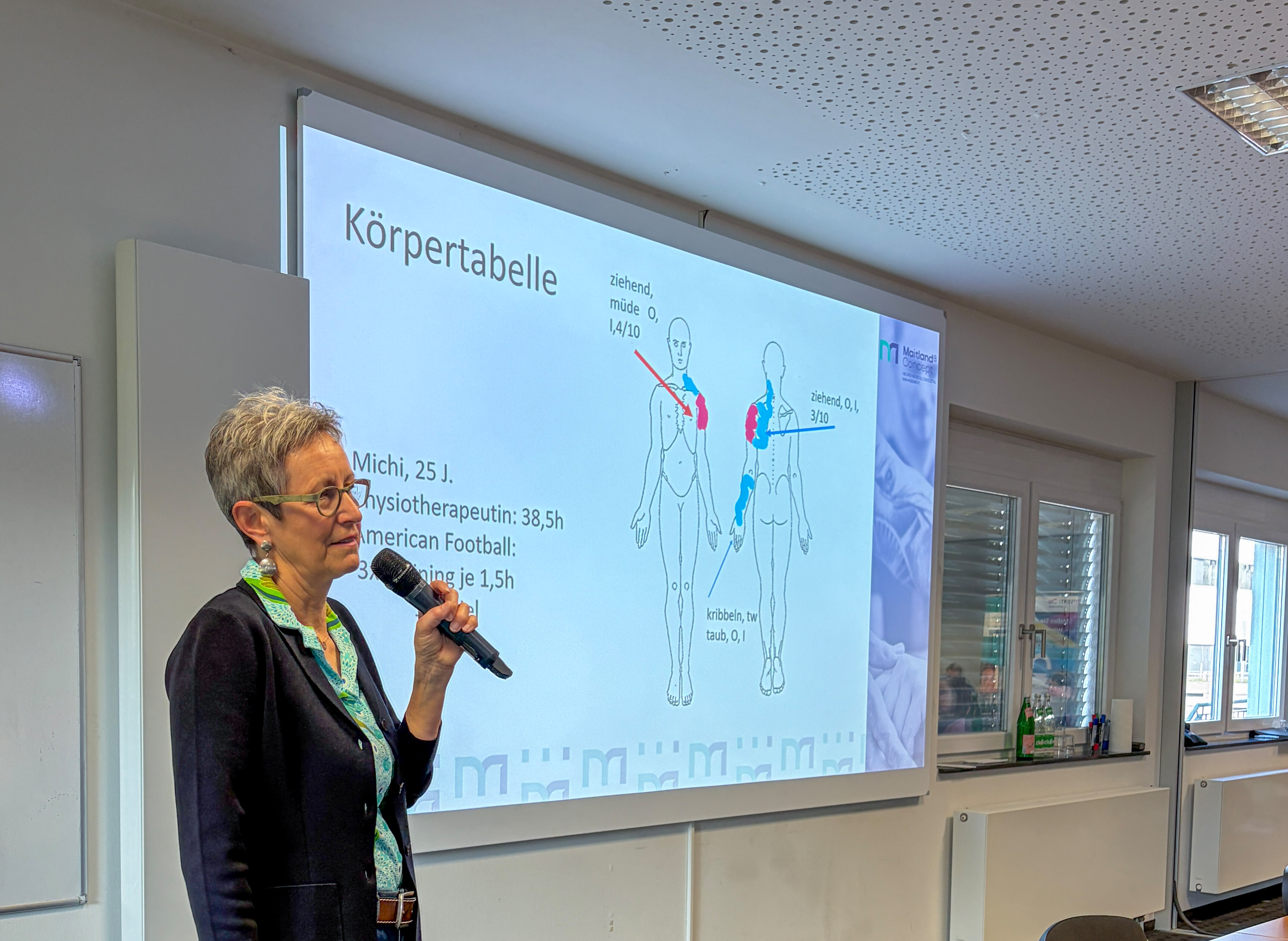 Damit überreichte er das Wort an die erste Referentin des Tages, Birgit Ferber-Busse. Die Fachlehrerin für Manuelle Therapie im Maitland®Konzept gibt bereits seit über 20 Jahren manualtherapeutische Fachvorträge und ist einigen Lesern vielleicht bereits von anderen IFK-Seminaren bekannt. In ihrem Vortrag „Klinisches Assessment von (minor) glenohumeraler Instabilität – ist es wirklich eine Instabilität?“ ging Ferber-Busse nach einer kurzen Einführung auf die Klassifikationsmöglichkeit, Tests, mögliche Faktoren und Therapiemöglichkeiten von Schulterinstabilität ein und veranschaulichte die Inhalte mittels zahlreicher Videos, die sie aus ihren Kursen mitgebracht hatte. Beim Punkt Laxität lud sie die Teilnehmer ein, den „Beighton Score“ mal selbst zu testen, was zu einigen schmerzverzerrten Gesichtern führte. Ein spannendes Fallbeispiel von einer Sportlerin aus dem American Football rundete den Vortrag ab und gab Gelegenheit, die zuvor vorgetragenen Erkenntnisse zu vertiefen.