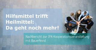 Diesen Herbst veranstaltete die Firma Bauerfeind in Kooperation mit dem IFK eine Informationsveranstaltung zum Thema „Hilfsmittel trifft Heilmittel“. In der einstündigen Veranstaltung wurden die wichtigsten Potenziale und Herausforderungen in der Zusammenarbeit von Heilmittelerbringern und Hilfsmitteltechnikern erörtert. Für den IFK sprachen Vorstandsvorsitzende Ute Repschläger und der Regionalausschussvorsitzende für Dresden, Clemens Hanske, zu dem Thema.